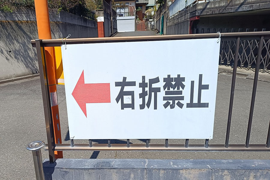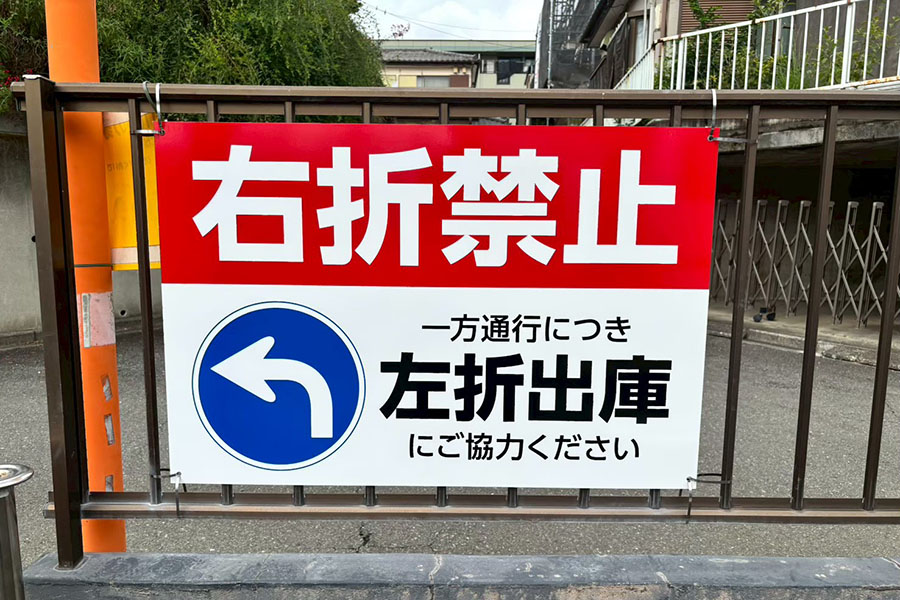 駐車場から道路に出る際、一方通行のための注意看板を新しくしました。アルミ複合板に塩ビシートを貼って作成しています。情報量が増えていますが、意図は伝わるようになりました。