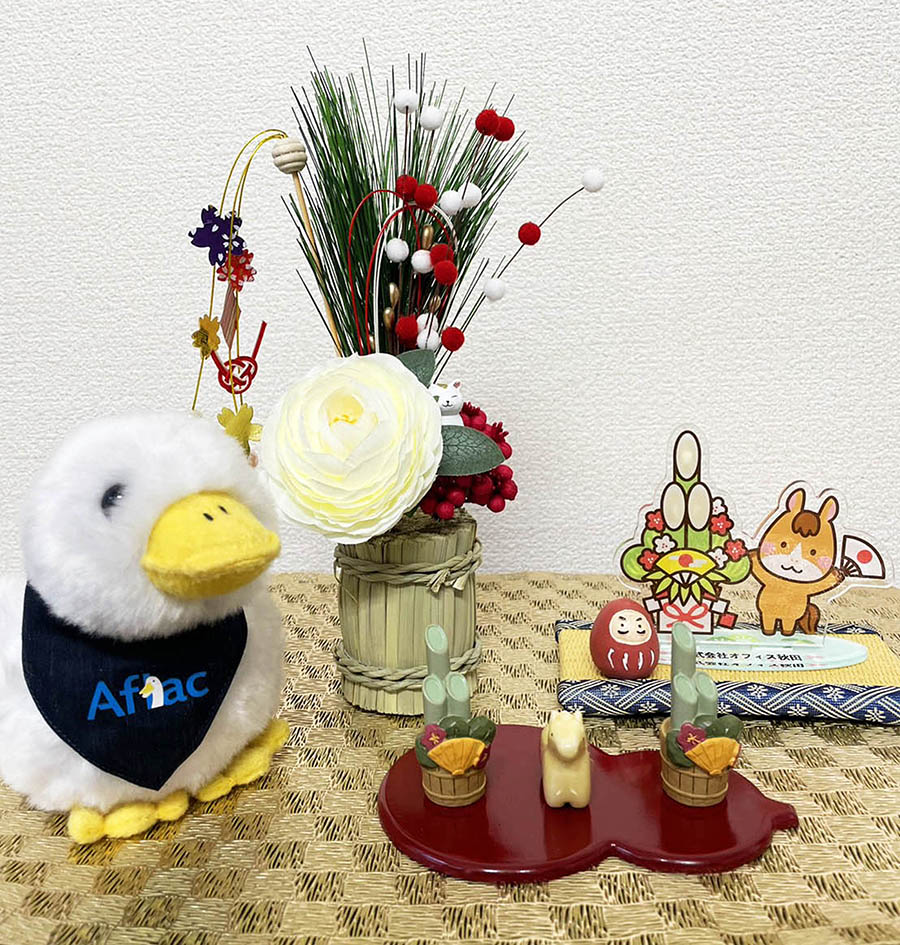 株式会社アイエスで年末に販売したアクリル商品。今回、株式会社オフィス秋田様でアクリルスタンドをディスプレイしている様子を撮影しました。きれいに並べられていますね。横にはアフラックのマスコットキャラもいます。