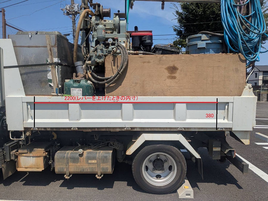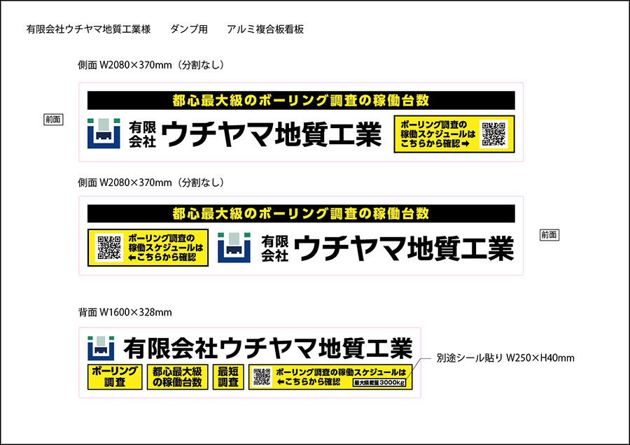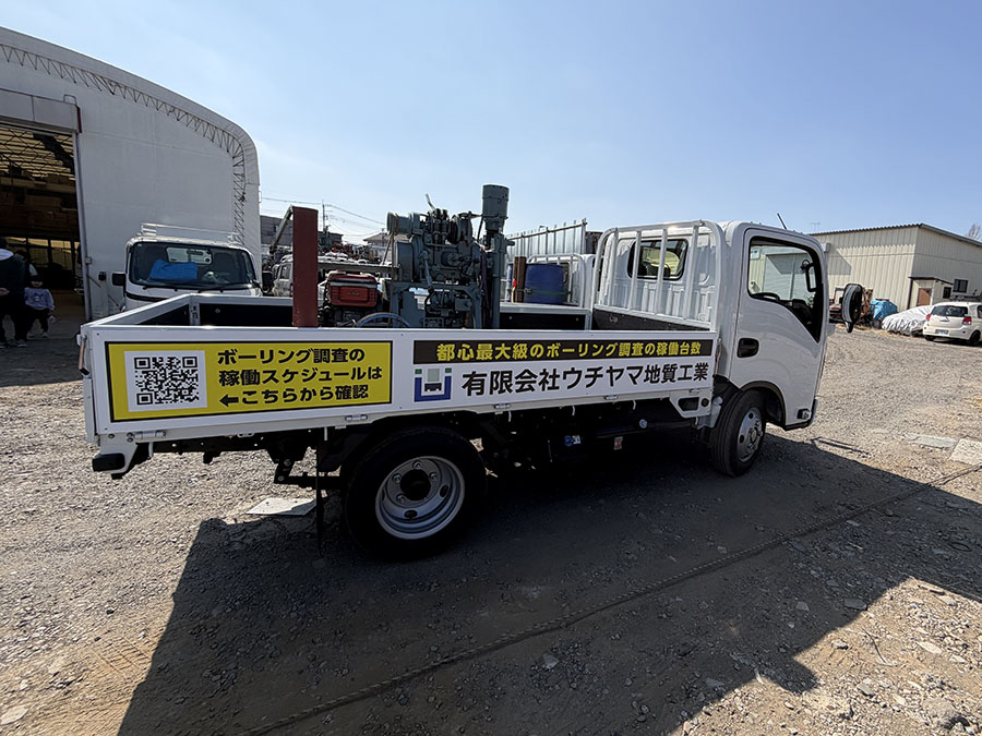 練馬区大泉学園町にある「ウチヤマ地質工業」様のダンプやトラック(平ボディー車)の荷台の3辺にアルミ複合板看板を取り付ける施工を行いました。